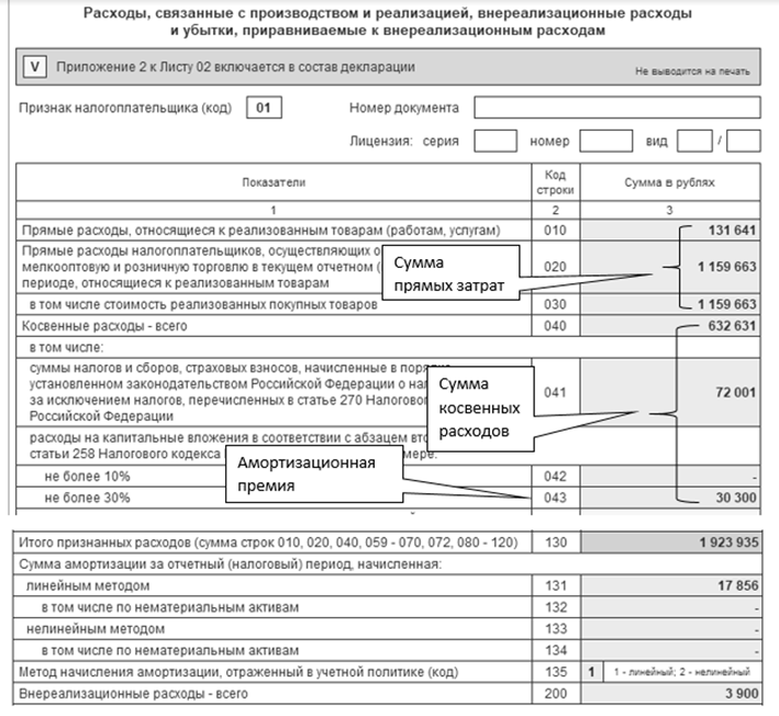 Обратите внимание, что амортизационная премия в размере 30% от первоначальной стоимости основных средств отражается в сумме 30 300 руб. в составе внереализационных расходов в приложении 2 к листу 02 по строке 043. В декларации по налогу на прибыль все косвенные расходы отражаются нарастающим итогом с начала года по строке 040 Приложения №2 к листу 02. Некоторые виды управленческих расходов, включаемых в строку 040, показываются отдельно: начисленные налоги и сборы, авансовые платежи по ним отражаются по строке 041; суммы амортизационных отчислений показываются по строкам 042 и 043; затраты на приобретение земельных участков и прав на заключение договора аренды земли – по строке 047 и т.д. Взносы на травматизм в по строке 041 приложения № 2 не отражают, они попадают в общую сумму косвенных расходов в строку 040 приложения № 2 к листу 02 (рис. 22.1.14).