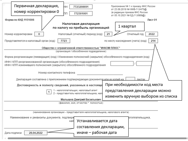 Составьте налоговый отчет "Декларация по налогу на прибыль" за I квартал 2022 года по ООО "ИНКОМ ПЛЮС". Настройте заполнение только раздела 1.1, разд. 1.3, листа 02 с его приложениями 1 и 2. Остальные листы выводить в отчет не следует.