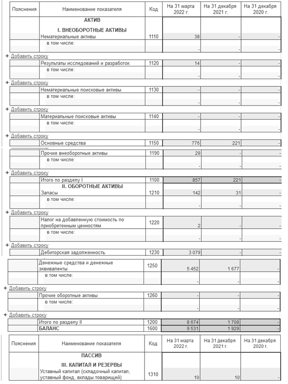 Итак, валюта баланса (актив равен пассиву стр. 1600 = стр. 1700) на 1 апреля 2022 года – 9 531 тыс. руб.