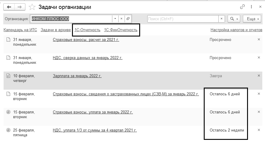 Обратиться к сервису "1С-Отчетность" можно и из списка "Задачи организации" (меню "Панель разделов/Главное/Панель навигации/Задачи/Задачи организации"). На рисунке 22.1.2 выделено обращение к сервисам по сдаче отчетности. В этой же форме видно, сколько дней осталось до сдачи отчета.