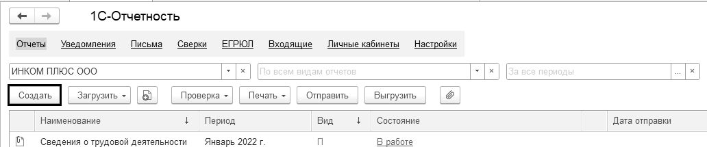 Работа с регламентированными отчетами в программе организована следующим образом. Выбирается отчет, который необходимо вам подготовить по кнопке "Отчеты/Создать/Все/выбрать нужный отчет".