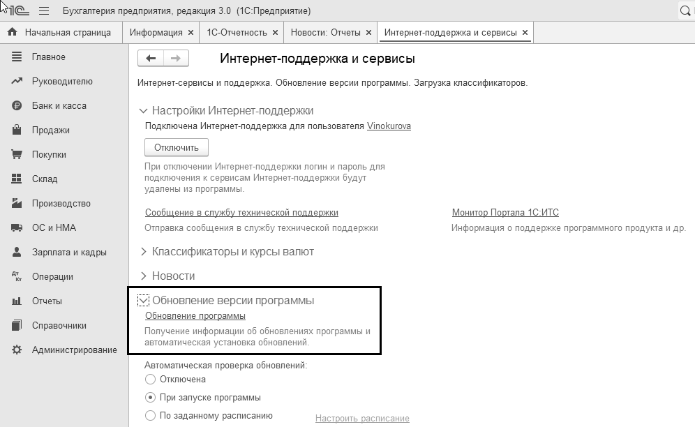 Перед формированием отчетности необходимо особенно важно обновить программу до последнего релиза. Обновляться конфигурация может посредством Интернет (меню "Панель разделов/ Администрирование/Панель навигации/Настройки программы/Интернет-поддержка и сервисы/Настройки Интернет-поддержки/Обновление версии программы/Обновление программы").