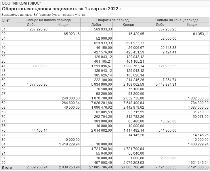 Составьте отчет "Оборотно-сальдовая ведомость" за I квартал 2022 года по ООО "ИНКОМ ПЛЮС" (рис. 22.1.6).