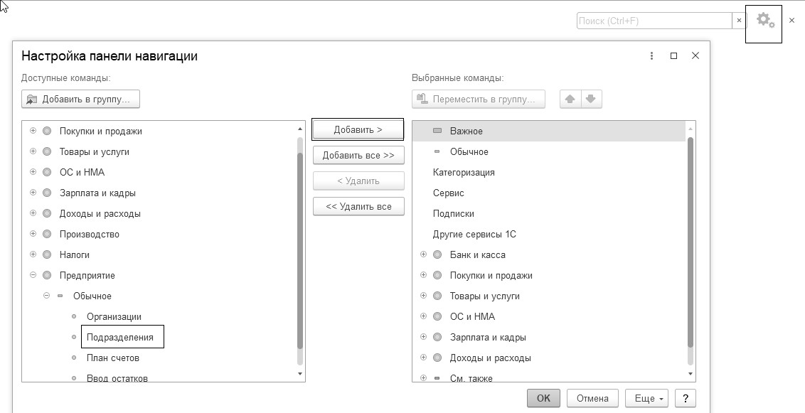 Кнопка "Настройка навигации" находится в верхнем правом углу панели навигации. В открывшемся окне встаньте в левой части формы, найдите ссылку "Подразделения". В середине формы нажмите кнопку "Добавить". Сохраните настройки при помощи кнопки "ОК". В результате выполненных действий на панели навигаций появится возможность обратиться к справочнику (рис. 1.7.2).