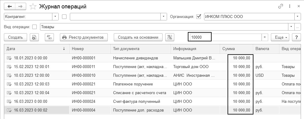 Работа с документами и справочниками производится в формах списка. В процессе работы требуется управлять видом списка, в том числе задавать группировки и сортировки, производить поиск документов или элементов справочника в списке. Непосредственно из формы списка могут выполняться и действия над группой объектов: пометка и снятие пометки на удаление, проведение и отмена проведения и т. д. Найдем в журнале операций все документы, у которых сумма 10 000 руб. (рис. 25.1).