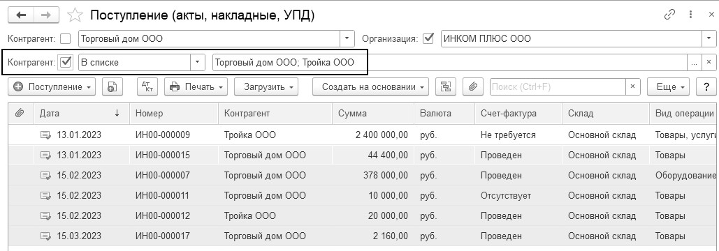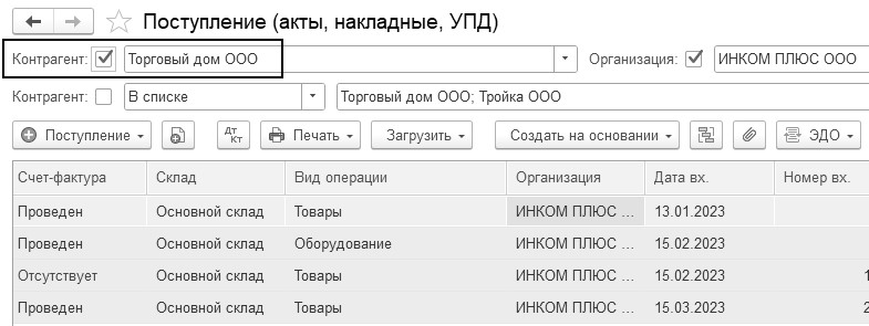 Рис. 25.5. Отбор по контрагенту Торговый дом, список "Поступление (акт, накладные, УПД)"