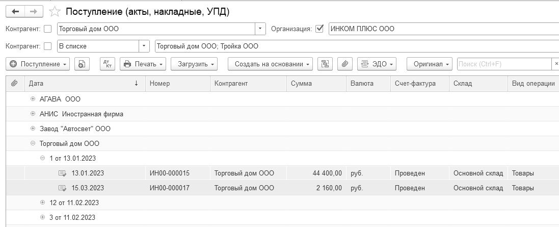 Установим в журнале документов "Поступление (акты, накладные, УПД)" отбор по контрагентам "Торговый дом" и "Тройка" (рис. 25.6).