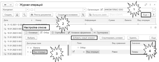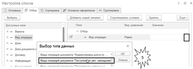 Рис. 25.2. Отбор по виду операции, настройка списка "Журнал операций"