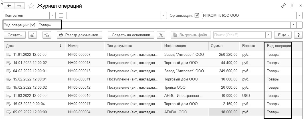 Отбор в журнале операции можно делать при помощи команды "Настройка списка", который устанавливается в форме "Еще/Настроить список". В форму может быть выведен ряд полей, по которым наиболее часто осуществляется отбор в данном списке. Например, для документов поступления или реализации товаров и услуг - это организация и контрагент. Дополнительно можно настроить отбор по любому доступному полю. Например, можно отобрать документы с видом операции "Товары" (рис. 25.2).