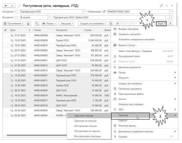 Выделить по ОРИОН в журнале "Поступление (акты, накладные, УПД)" те документы (строки), по которым в организацию не поступили оригиналы входящих документов.