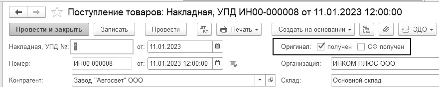 В нескольких формах документов "Поступление (акты, накладные, УПД)" можно установить флаг "Оригинал получен", если от поставщика получены входящие документы (оригиналы). Этот реквизит появится в списке журнала в колонке "Оригинал" формы документа (рис. 25.3).