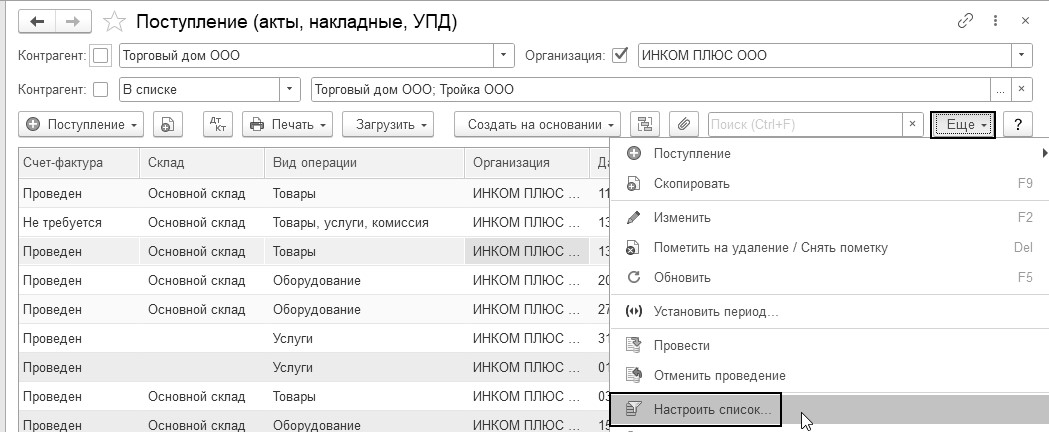 В журнале документов "Поступление (акты, накладные, УПД)" можно сформировать список по нескольким контрагентам. Для это применяется команда "Еще/Настроить список" (рис. 25.6).