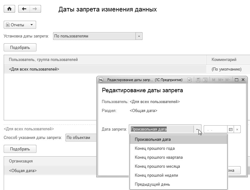 Дату запрета изменения данных можно не устанавливать, а можно устанавливать одну для всех пользователей, или каждому пользователю свою дату (рис. 26.4.1).