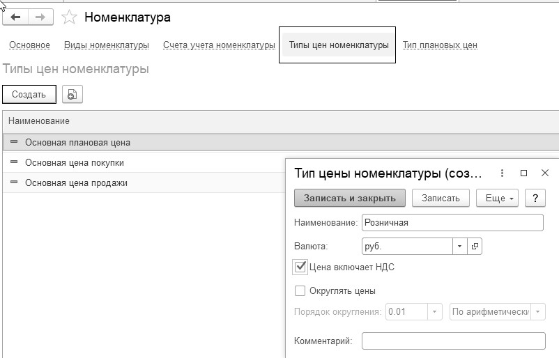 Тип цен можно указать в договоре. Обратите внимание, что у одного элемента номенклатуры может быть довольно большое количество типов цен на различные случаи. А может вообще не быть ни одного, и это тоже нормально. Новые типы цен могут появляться в процессе работы, когда элемент справочника "Номенклатура" уже существует и используется в работе.
