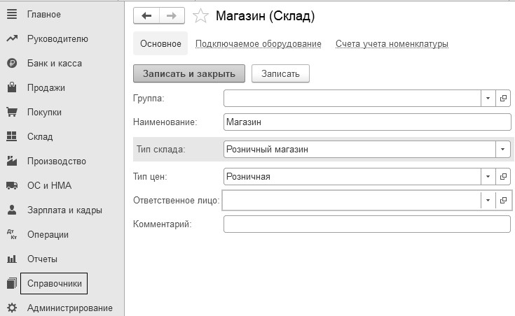 Справочник "Склады". В организации есть основной склад и магазин. Создайте склад – "Магазин". Для магазина установите тип цен "Розничная", тип склада "Розничный магазин" (рис. 1.10.1).