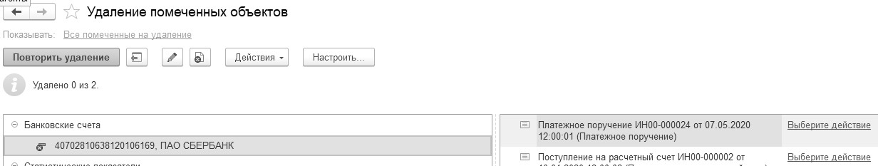 Пометка удаления позволяет помечать элементы справочника на удаление – после этого действия, изменяется иконка элемента справочника, добавляется перечеркивание, но данные продолжают отображаться. Операции и ее проводки помечаются на удаление, и не оказывают влияния на бухгалтерские итоги.
