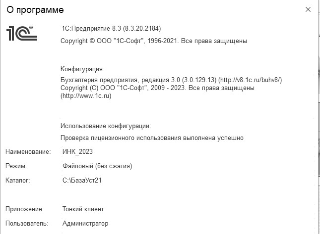 Здесь Вы сможете узнать все о вашей программе. Тут Вы увидите путь, куда установлена Ваша информационная база. А скобки справа подскажут, какая платформа (верхние скобки) и какой релиз программы (нижние скобки) используется Вами. Например,