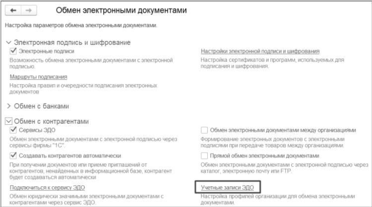 Чтобы создать новую, нужно нажать на кнопку "Создать". Заполнение формы наполовину делается автоматически: реквизиты компании выводятся на основании введенных ранее данных. Подбором можно выбрать сотрудника, на которого выдается документ. После того, как заполнены все графы, остается нажать на кнопку "Подписать и отправить". Затем система зарегистрирует доверенность, проверить это можно, обновив статус. Далее нужно будет зарегистрировать сертификат и МЧД у оператора ЭДО – внутри системы - это сервис 1С-ЭДО. Этот пункт нужно искать в разделе "Администрирование/Обмен электронными документами" и "Учетные записи ЭДО" (рис. 4).