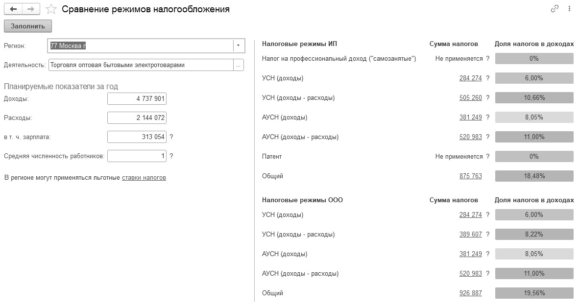 Обработка "Сравнение режимов налогообложения", с учетом региональных особенностей, сравнивает режимы: