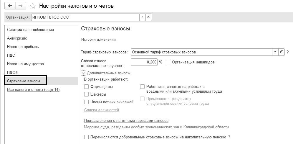 В программе 1С тарифы страховых взносов и дополнительные страховые взносы на работников, занятых на работах с вредными и тяжелыми условиями труда учитываются раздельно: