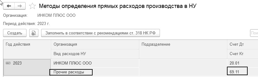 Перед начислением заработной платы следует подкорректировать справочник "Статьи затрат по страховым взносам" под перечень прямых расходов, указанных в учетной политике. Если обратиться к регистру сведений "Методы определения прямых расходов производства в НУ", то можно увидеть, что счет 69.11 по кредиту корреспондирует со счетами 20.01, 23 по виду расходов "Прочие расходы" (рис. 2.1.2).