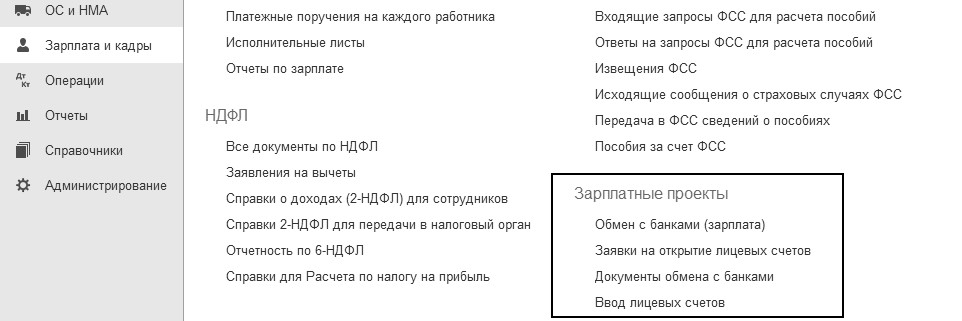 После установки флага становятся доступны рабочее место для обмена с банками по зарплатным проектам и соответствующие документы, которые формируются из этого рабочего места (рис. 2.4.1).