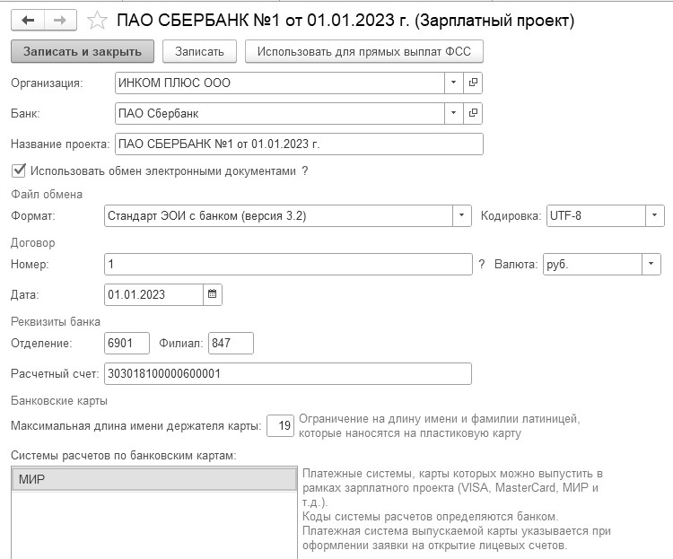 01.01.2023 года создаете документ "Зарплатный проект". Занесите в форму ПАО "Сбербанк", договор № 1 от 01.01.2023 года. В табличную часть добавьте систему расчетов МИР (рис. 2.4.2).