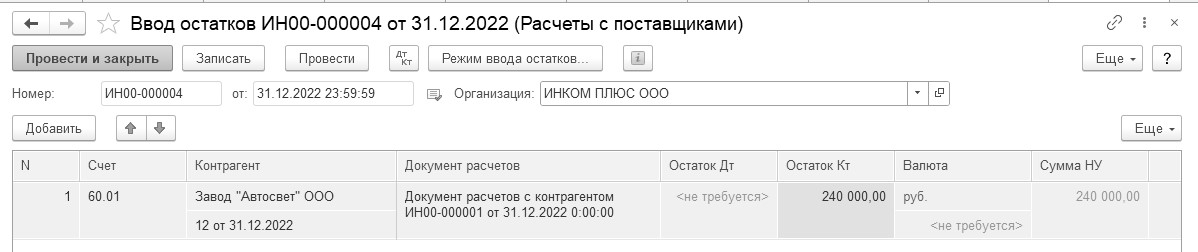 Необходимо занести информацию по кредиту счета 60.01. Сведения для заполнения: "Завод АВТОСВЕТ", договор на сумму 240 000 руб., в том числе НДС 20%. Реквизиты договора: № 12 от 31.12.2022 года, действует до 31.12.2023 года. Вид договора – "С поставщиком", отражение в отчетности – запасы.