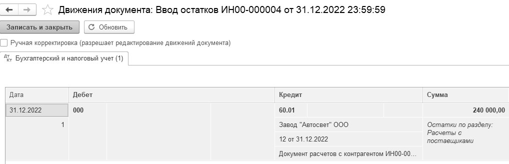 Проведенный документ "Ввод остатков" оформит бухгалтерскую запись, отраженную на рисунке 4.2.2.