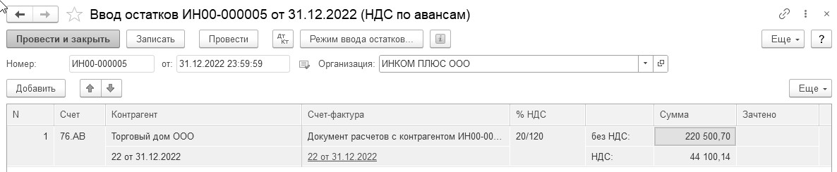 Данные счета-фактуры на аванс: № 22 от 31.12.2022 года. Заполните документ "Ввод остатков" так, как представлено на рисунке 4.2.3.