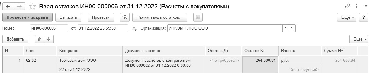 Необходимо занести информацию по кредиту счета 62.02 от ООО "Торговый дом" на сумму 264 600,84 руб. Выберите в табличную часть тот документ расчета, который был создан для счета 76.АВ. Реквизиты документа расчетов: № 22 от 31.12.2022 года. Проведите документ "Ввод остатков" по разделу учета "Расчеты с покупателями" (рис. 4.2.4).