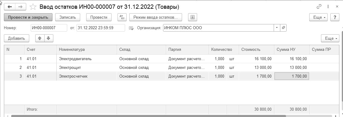 [1] Откройте в справочнике "Номенклатура" папку "Товары". Выберите из нее три элемента: электродвигатель, электрощит, электросчетчик. При вводе проводок № 1, 2, 3 в качестве второго субконто выберите – "Основной склад". При заполнении третьего субконто необходимо выбрать тот документ расчетов поставщика "Завод АВТОСВЕТ", который был создан для счета 60.01. Если третье субконто не заполнить, то в последующем при реализации этих товаров документ "Реализация (акт, накладная, УПД)" проводиться не будет. Для номенклатуры следует указать отдельно сумму бухгалтерскую, и сумму налоговую.