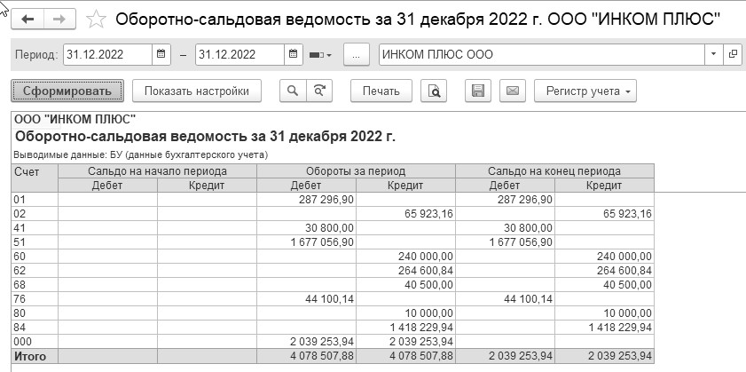 Рис. 4.3.3. Форма окна отчета "Оборотно-сальдовая ведомость" за 31.12.2022 года