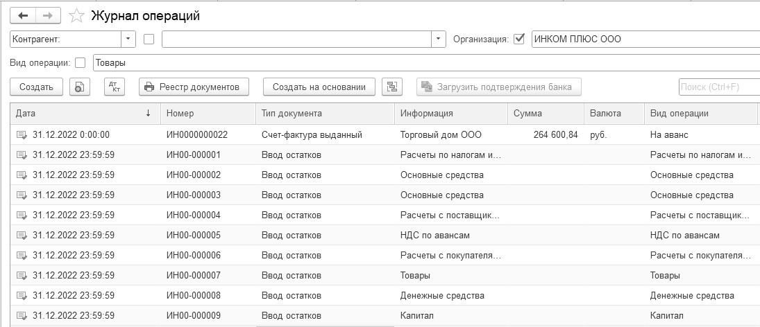 Все операции, введенные в программу, отражаются в "Журнале операций", который представляет собой их хронологический список, здесь отображаются все операции, как введенные документами программы, так и с использованием типовой операции или вручную.
