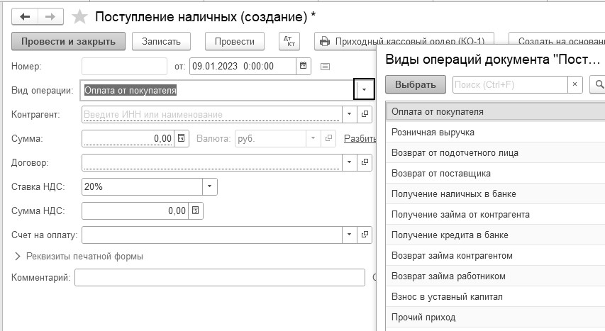 Рис. 5.1.1. Электронная форма документа "Поступление наличных"