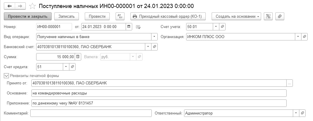 24.01.2023 года из банка с расчетного счета поступили в кассу организации "ИНКОМ ПЛЮС" денежные средства на командировочные расходы в сумме 15 000 руб. по денежному чеку №АУ 8131457.