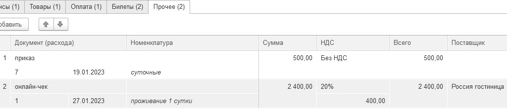 - гостиница – 2 400 руб. В онлайн-чеке №1 и счете-фактуре № 1 от 27.01.2023 года гостиницы "Россия" выделен НДС 20% (400 руб.);