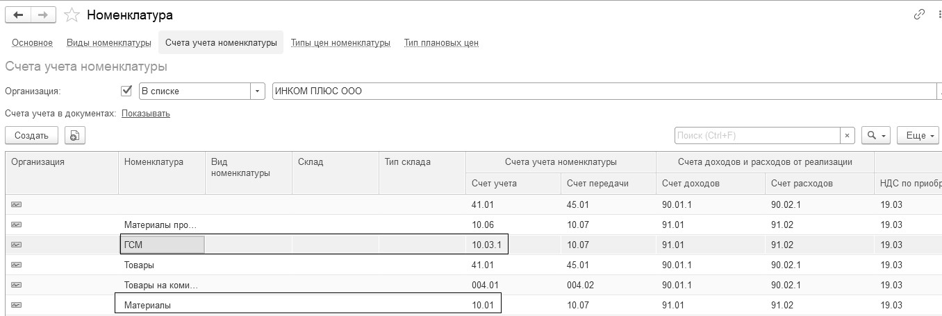 В корне справочника "Номенклатура" создайте папку "ГСМ". Для данной папки следует скопировать все те счета, которые назначены папке "Материалы". Для этого откройте справочник "Счета учета номенклатуры", скопируйте папку "Материалы" (F9), выберите вместо нее папку "ГСМ", и замените счет 10.01 на счет 10.03.1. Сравните выполнение задания с рисунком 6.1.9.