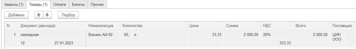 27.01.2023 года принят авансовый отчет от Остапенко Е.Д. о покупке 60 литров бензина АИ-92 на сумму 2 000 руб., НДС 20% в том числе (корр. счет 10.03.1). ООО "ЦИН" представил накладную № 12 и счет-фактуру № 12 от 27.01.2023 года. Бензин оприходован на основной склад.