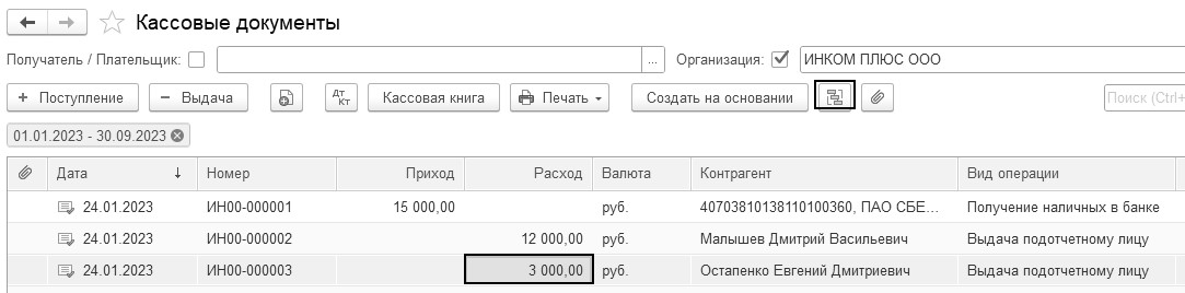 31.01.2023 года сотрудник Остапенко Е. Д. возвратил в кассу "ИНКОМ ПЛЮС" неиспользованную сумму 1 000 руб. Создайте документ "Поступление наличных".