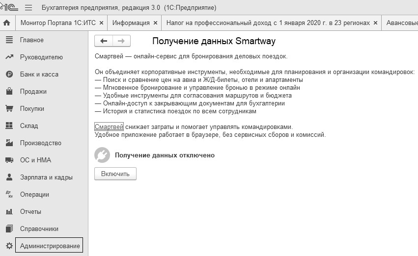 - Авансовый отчет по командировкам – новая форма (вся информация размещается на одной странице), которая поддерживает онлайн-сервис Smartway[1] (smartway.today), причем, настройки интеграции выполняются в форме "Получение данных Smartway" раздела "Администрирование" (рис. 6.1.2).