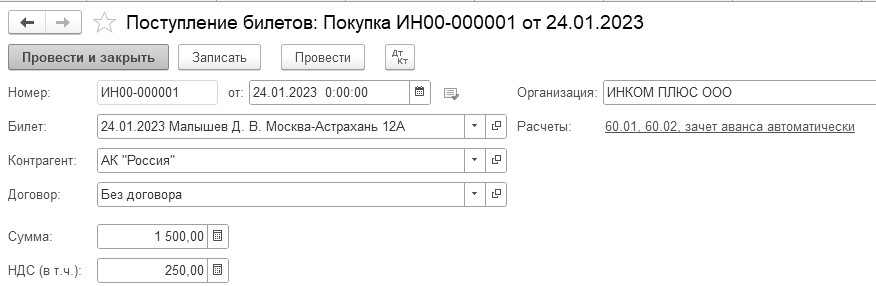 Д 76.14 К 60.01 – покупка билетов у АК Россия