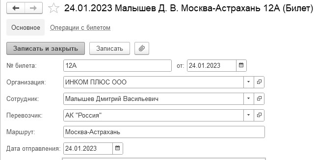 Создать два документа "Поступление билетов" от 24.01.2023 на даты вылета 24.01.2023 и 28.01.2023 года, ориентируясь на рисунок 6.1.4.