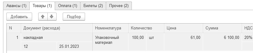 Рис. 6.1.5. Форма окна документа "Авансовый отчет", закладка "Товары"