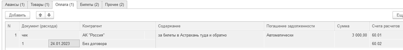 Заполните закладки "Авансы", "Товары", "Оплата", "Билеты" и "Прочее".