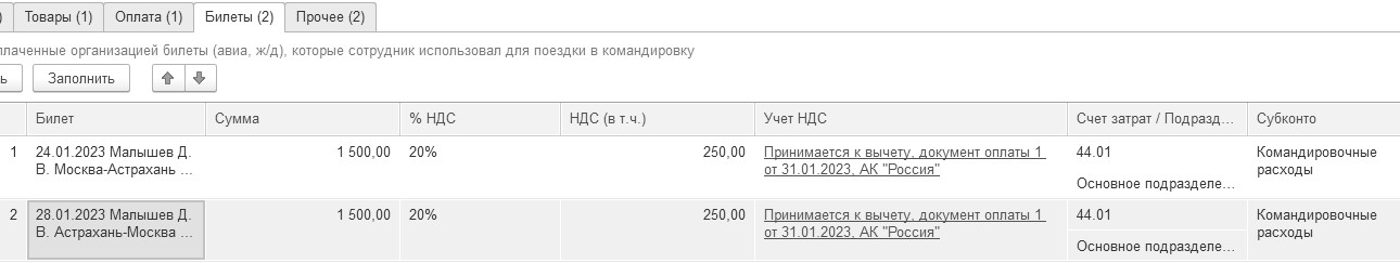 - Авиабилет № 12А Москва - Астрахань – 1500 руб., в т. ч. НДС 20% (250 руб.). перевозчик АК "Россия" от 24.01.2023 года;