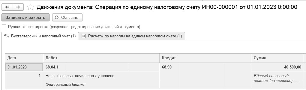 Рис. 7.2.7. Движения документа "Операция по единому налоговому счету"