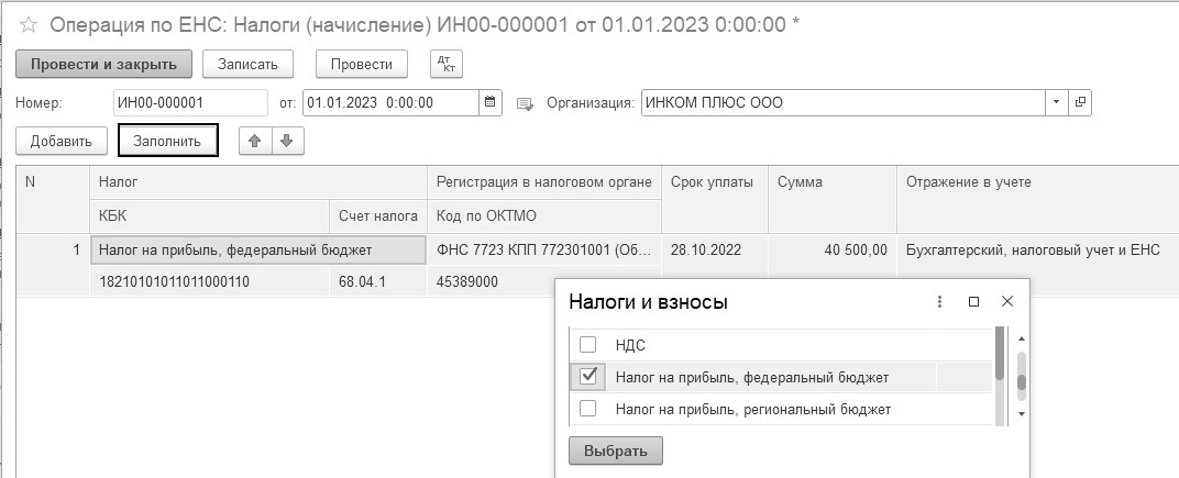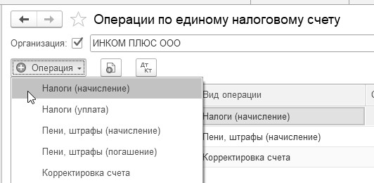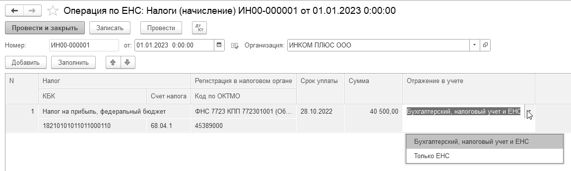 Документ "Операция по ЕНС" с видом операции "Налоги (уплата)" или "Пени, штрафы (погашение)" применяют для корректировки распределения ЕНП между налогами, пенями и штрафами, если автоматически выполненный зачет ЕНП не совпал с зачетом ФНС.