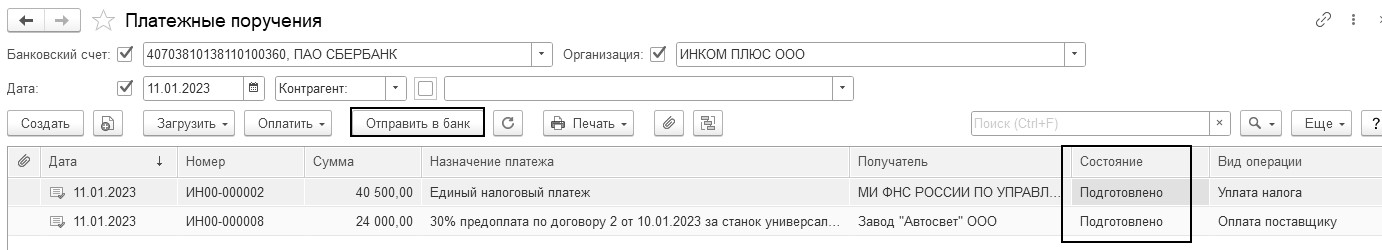 Открыв список платежных поручений при помощи кнопки "Отправить в банк" можно выгрузить документы в банк. Но выгрузить можно в том случае, если документы проведены.