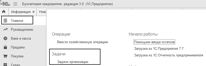 В программе есть еще один способ получить заполненное платежное поручение. И именно этот способ рекомендуют разработчики, т. к. обработка будет подставлять в платежный документ именно ту сумму налога, которую следует уплатить за этот период. Для этого надо зайти в раздел "Главное/Задачи организации" (рис. 7.2.11).